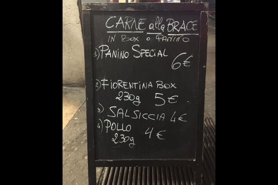 Il nostro menù è molto semplice, (anche se le novità non mancano mai): ai nostri clienti offriamo gustosi e saporiti panini, il nostro "PANINO SPECIAL” è composto da un soffice panino, al rosmarino, o in edizione limitata per l'estate, al peperoncino, con carne (fiorentina, pollo, salsiccia paesana), verdure miste alla brace e con un’ampia scelta di salse…….E per chi non volesse il pane abbiamo un comodo e pratico cup take away. A breve verrà introdotta la carne di cavallo.