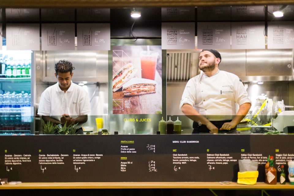 SANDWICH - Classic Club Sandwich (pane in cassetta, tacchino arrosto, uovo sodo, crispy bacon, pomodoro, lattuga, dressing GstF); Salmon Club Sandwich (pane in cassetta integrale, salmone affumicato, cream cheese, cetriolo fresco, lattuga romana, senape all’aneto, limone, pepe); Italian Club Sandwich (pane in cassetta, prosciutto crudo di Parma, mozzarella, pomodoro, rucola, olio extra vergine di oliva, sale, pepe); Veggie Club Sandwich (pane in cassetta integrale, mozzarella, verdure alla griglia, pomodoro, rucola, paté di olive taggiasche)